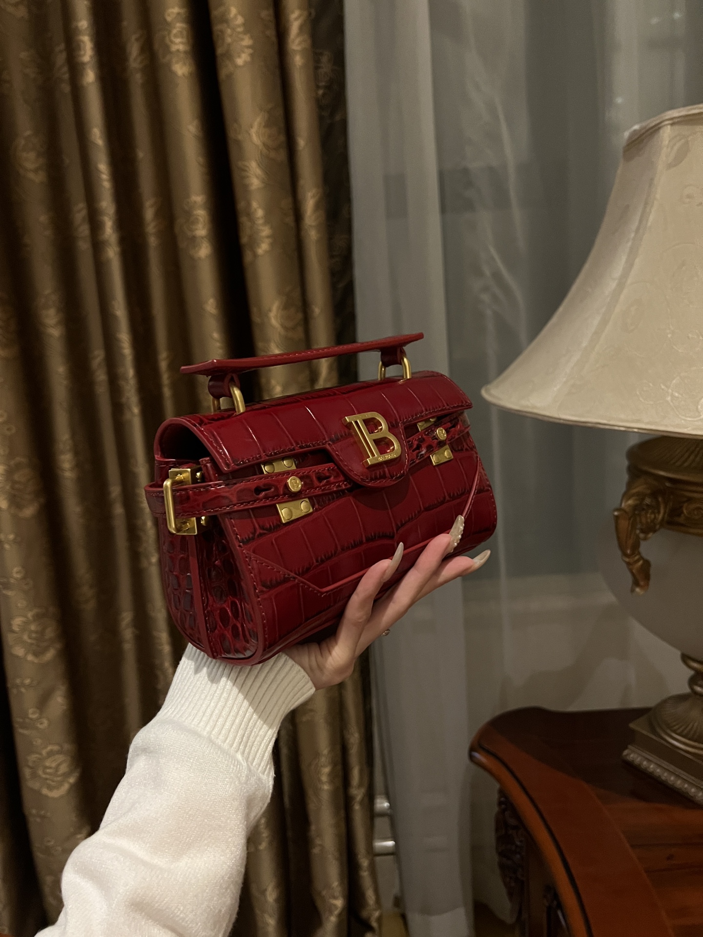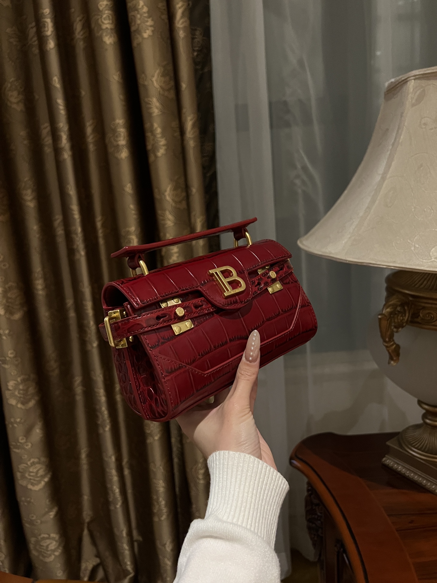 • Elegant Design: The rich red color and gold-tone hardware create a striking contrast, adding a touch of glamour to any outfit. The iconic "B" logo clasp enhances its luxurious appeal.