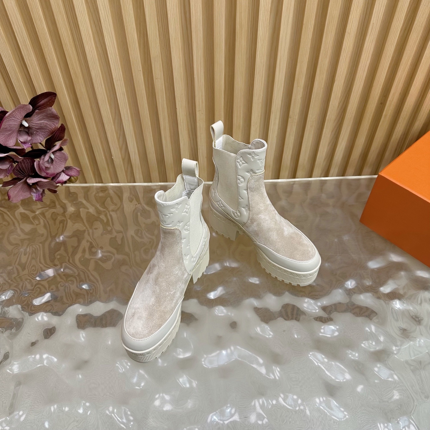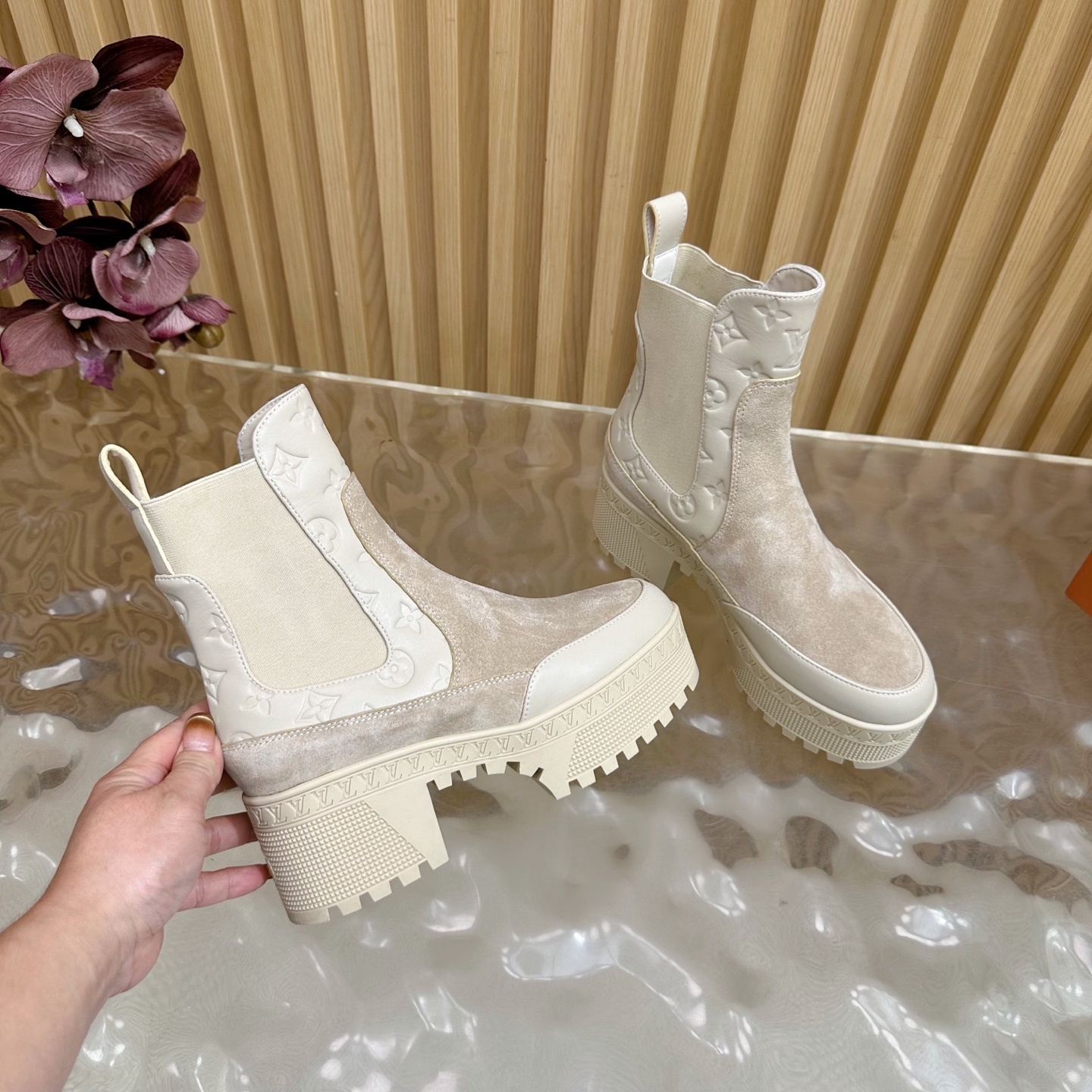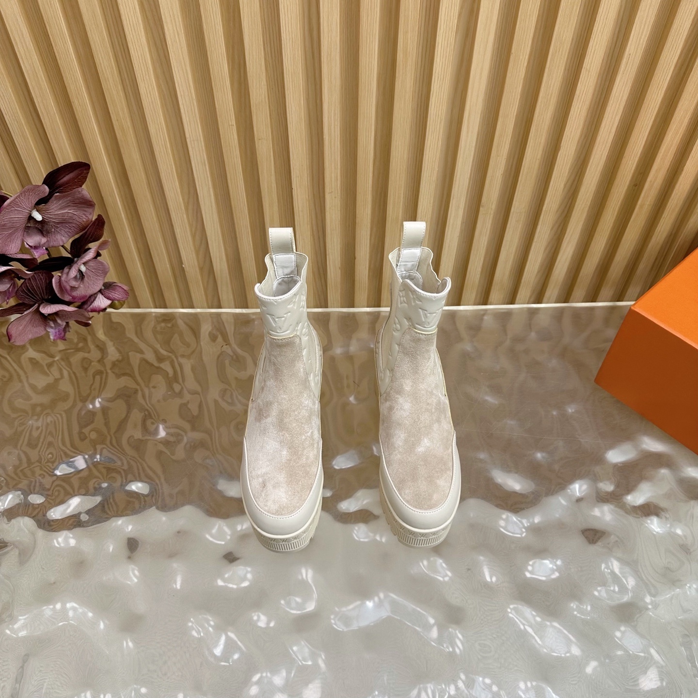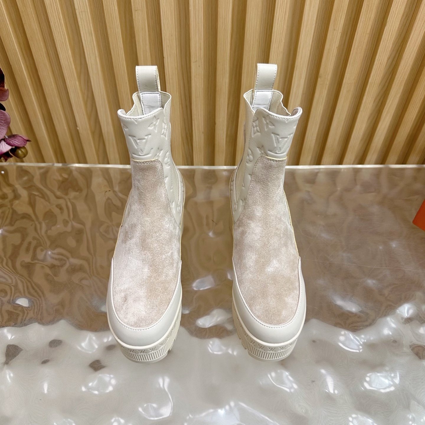 Step out in confidence with our Women's Luxury Monogram Platform Chelsea Ankle Boots. These boots perfectly blend high-fashion aesthetics with everyday practicality, featuring a sophisticated cream palette that complements any outfit seamlessly.